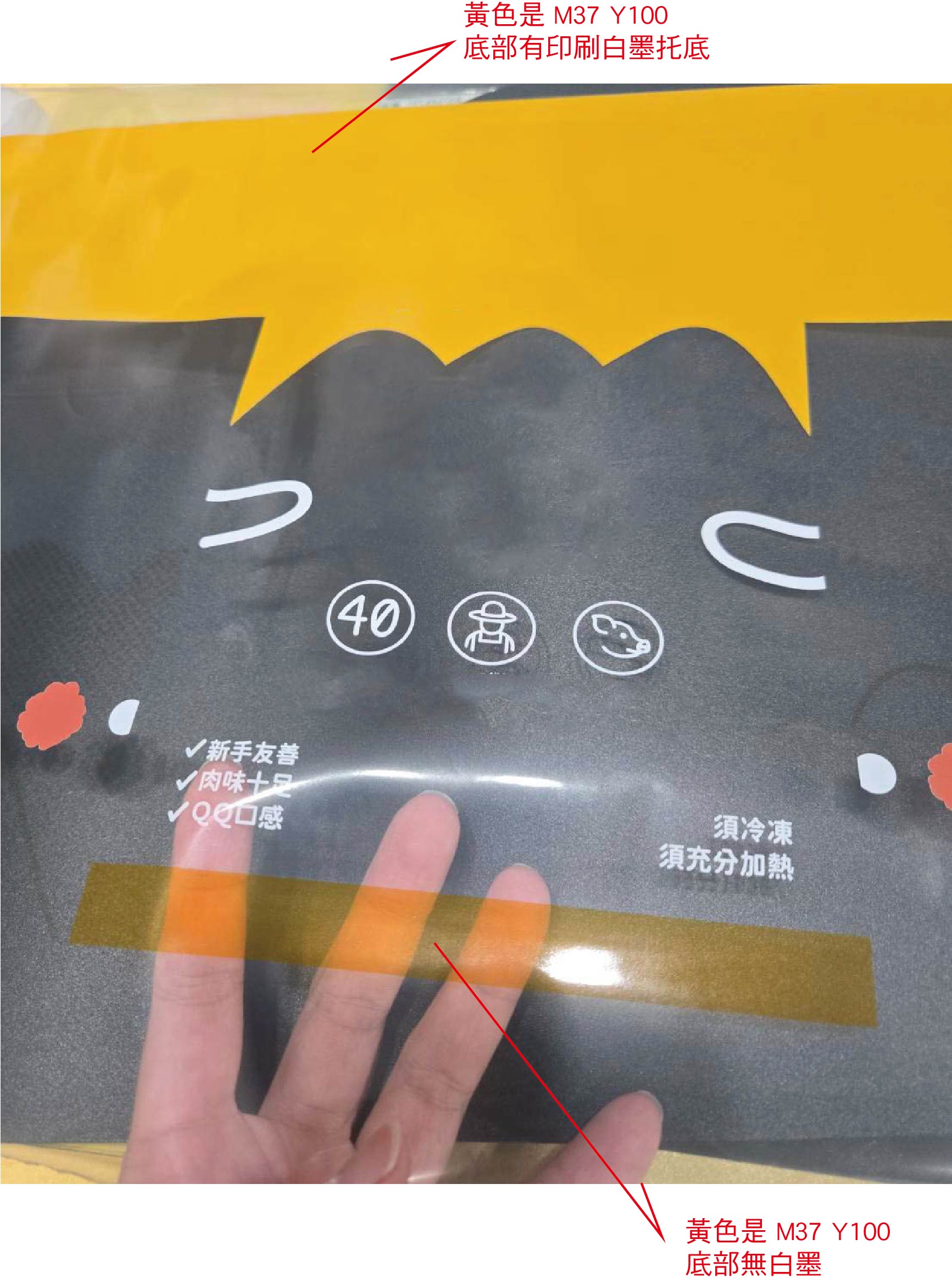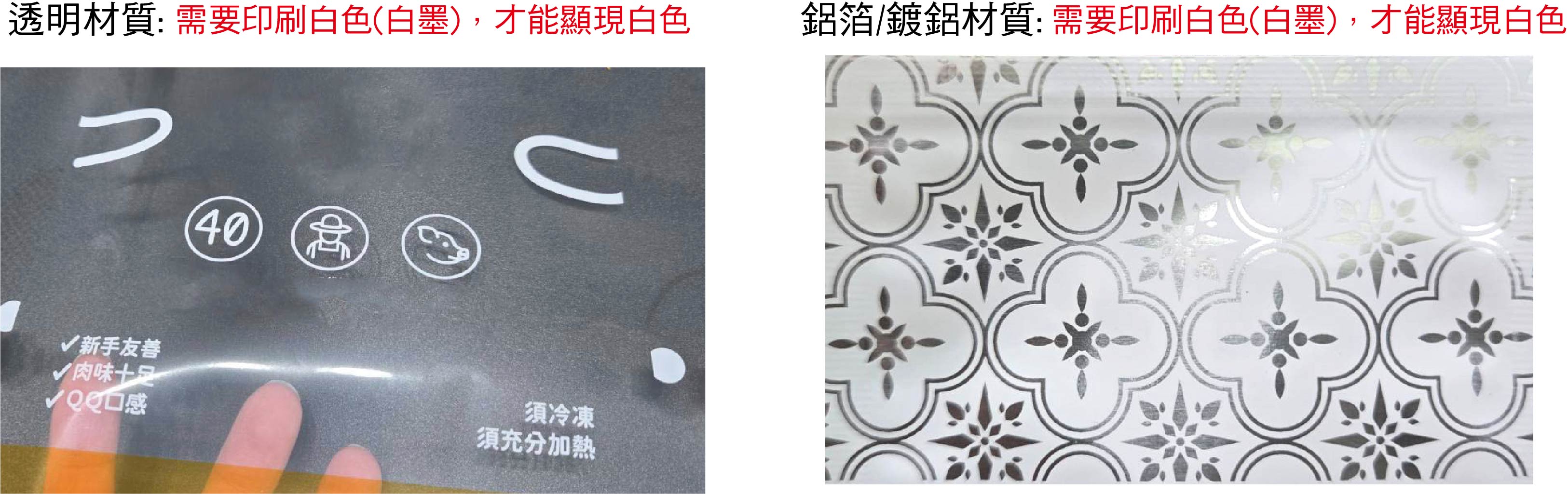 - 在軟包裝中,「白色」不是不印刷,而是要特別印白墨才會出現白色