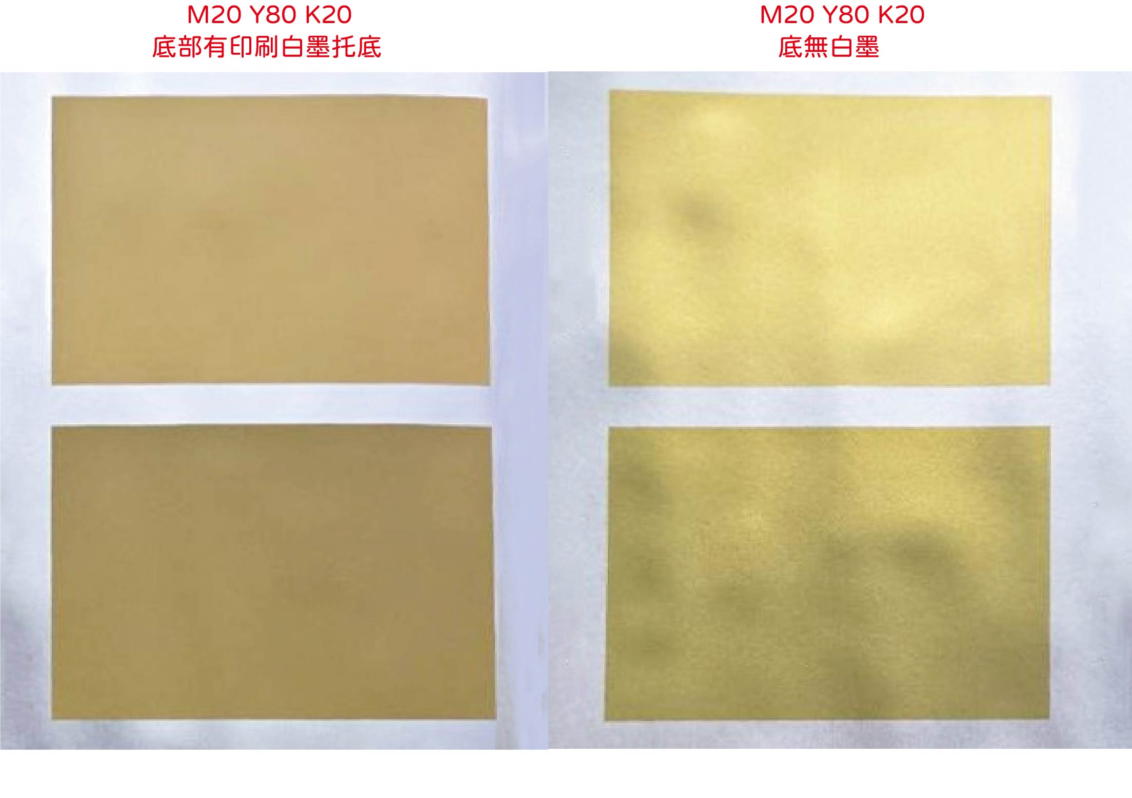 在鋁箔/鍍鋁材質材料,如下圖所示: (左圖)白墨托底會有遮亮效果,(右圖)無白墨托底印刷會呈現仿燙金效果