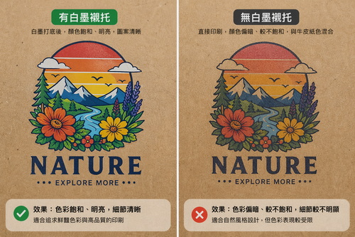 在牛皮材質,如下圖所示:(左圖)白墨托底會顏色較飽和,(右圖)無白墨托底您的設計可能會被材質本身顏色影響,而吃掉原本的顏色