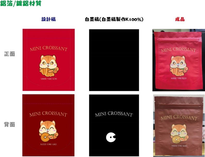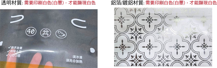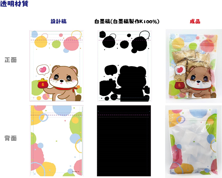3.透明/鋁箔/鍍鋁材質:圖文設計中含有白色,材質並非白色時,需要印刷白墨才能顯現