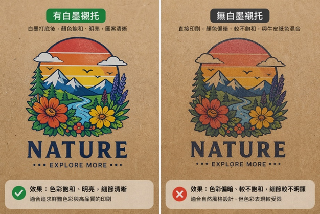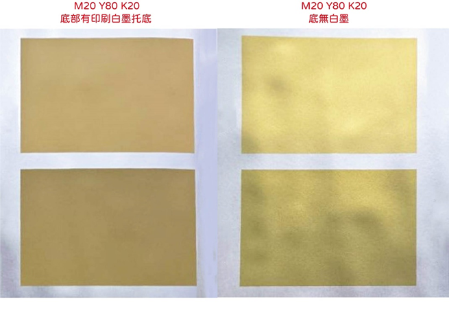 1.在透明材質:上印刷仍會呈現半透明狀態,需以白墨托底會有遮光效果,如下圖所示