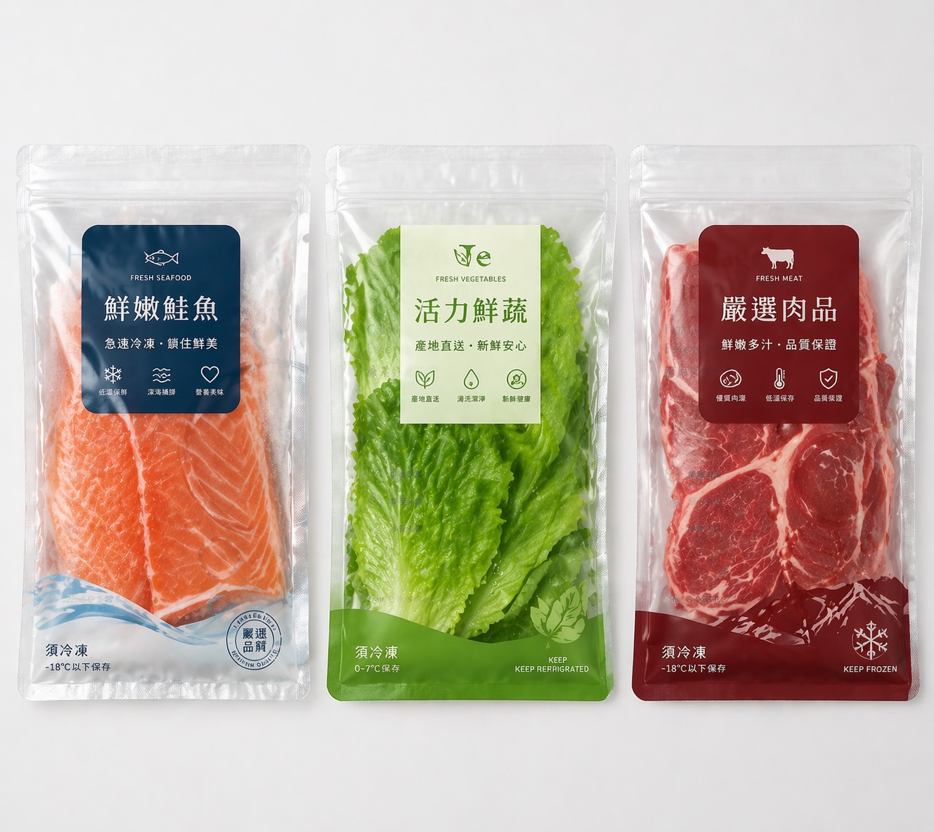 生鮮食材包裝袋主要應用於肉品、水產、蔬果與冷凍食品等產品,包裝需同時具備保鮮、耐低溫、防滲漏與阻氧效果,以確保食材在冷藏與冷凍運輸過程中維持新鮮與安全。